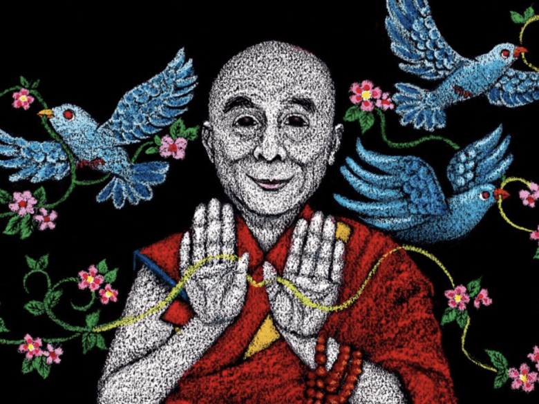 Rima Fujita, H. H. the 14th Dalai Lama – Spreading Love, mixed media on paper, 20″ x 18″ Courtesy of the artist