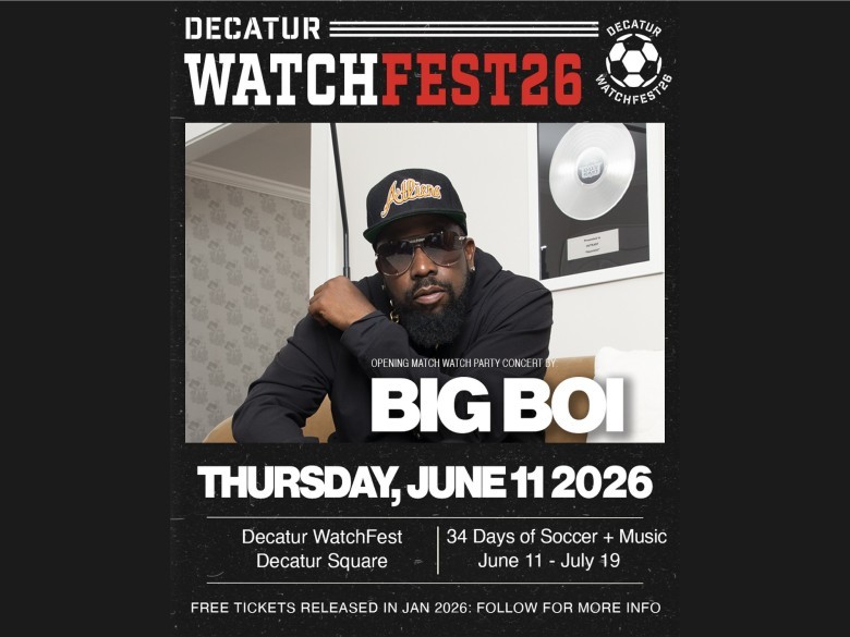 Decatur is celebrating world-class soccer with a series of free concerts at Decatur WatchFest ‘26 on the city’s new performance stage on the downtown square. Atlanta’s own Big Boi kicks off the festivities with an opening concert on June 11. Concert time to be announced.
